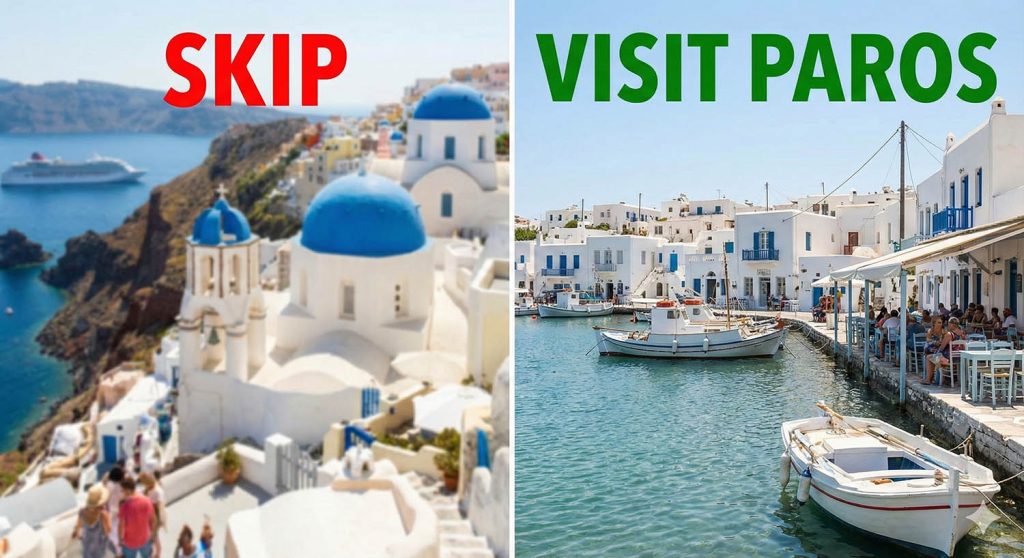 The Paros Difference: Paros offers the quintessential Cycladic aesthetic—sugar-cube white houses, magenta bougainvillea, and blue shutters—without the crushing density.